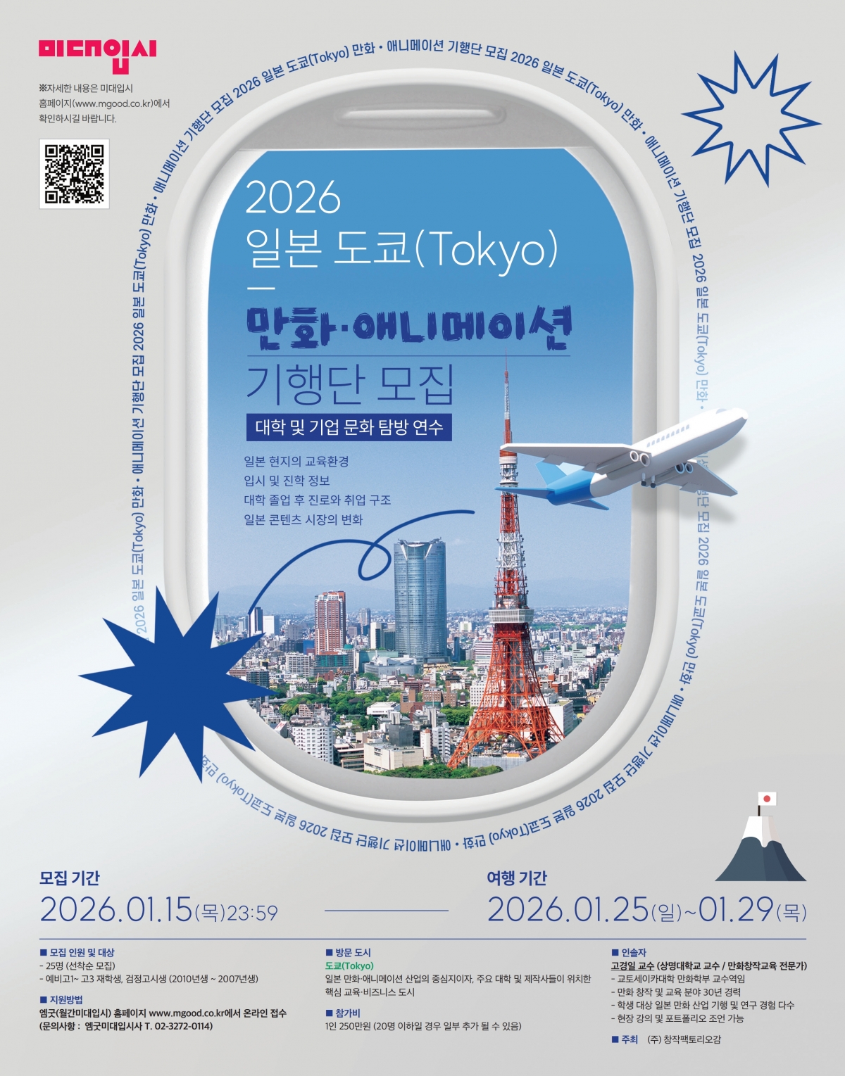 종료 2026 일본 도쿄(Tokyo... [접수기간] 2025-12-15(월) ~2026-01-08(목) [내용] 만화·애니메이션대학 지망생을 위한 최고의 현장 기행 참가신청하기 종료 미대나와서 뭐해? [접수기간] 2025-01-16(목) ~2025-02-07(금) [내용] 미대 출신 선배가 들려주는 현장토크 참가신청하기 1