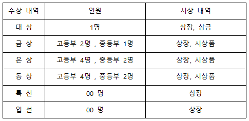- 중등부 | 고등 1부(1~2학년), 고등 2부(고3~기타)를 나누어 심사 및 시상