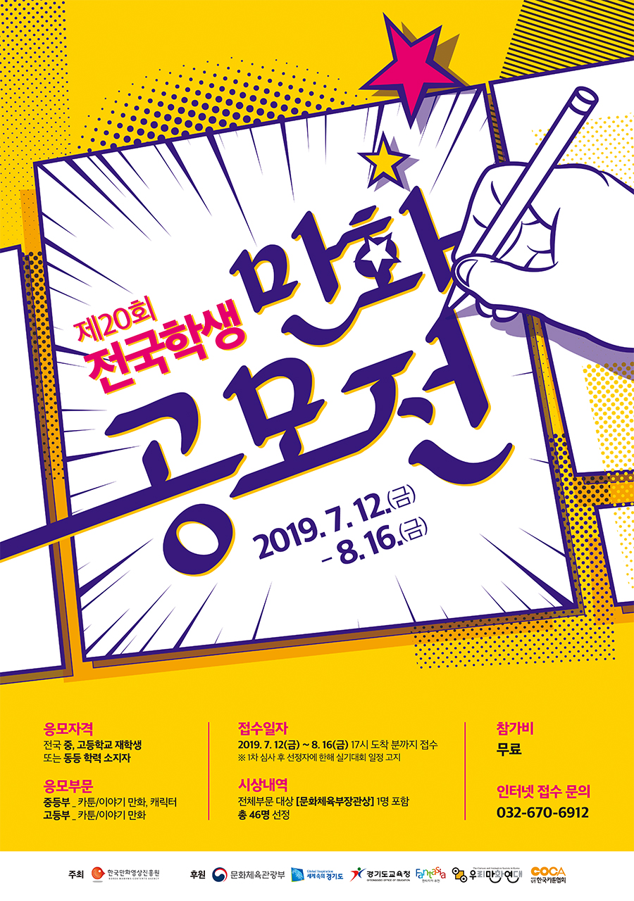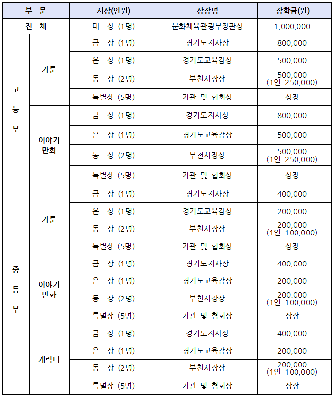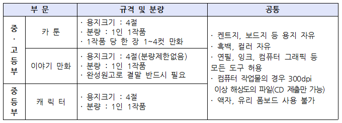 - 응모부문 : [고등부 : 카툰/이야기 만화] [중등부 : 카툰/이야기 만화, 캐릭터]
