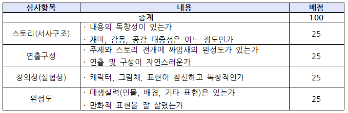 - 심사기준 : 스토리(서사구조), 연출구성, 창의성(실험성), 완성도