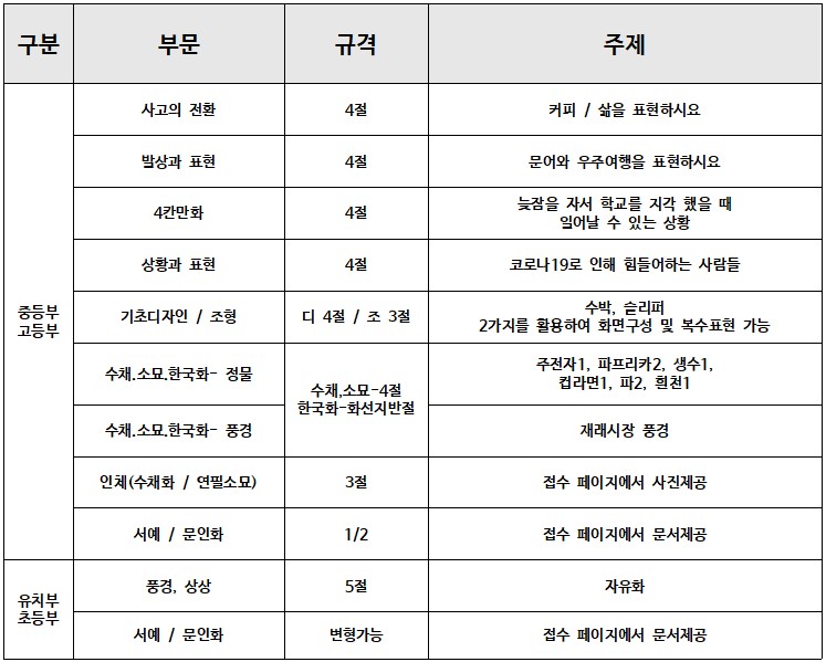 사고의전환, 발상과표현, 4칸만화, 상황과표현, 기초디자인, 기초조형, 수채(정물), 소묘(정물), 한국화(정물), 수채(풍경), 소묘(풍경), 한국화(풍경), 인체(수채화), 인체(연필소묘), 서예, 문인화 |