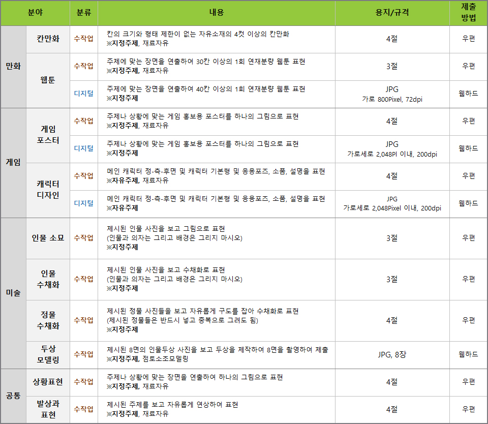 만화-칸만화[수작업], 만화-웹툰[수작업], 만화-웹툰[디지털], 게임-게임포스터[수작업], 게임-게임포스터[디지털],