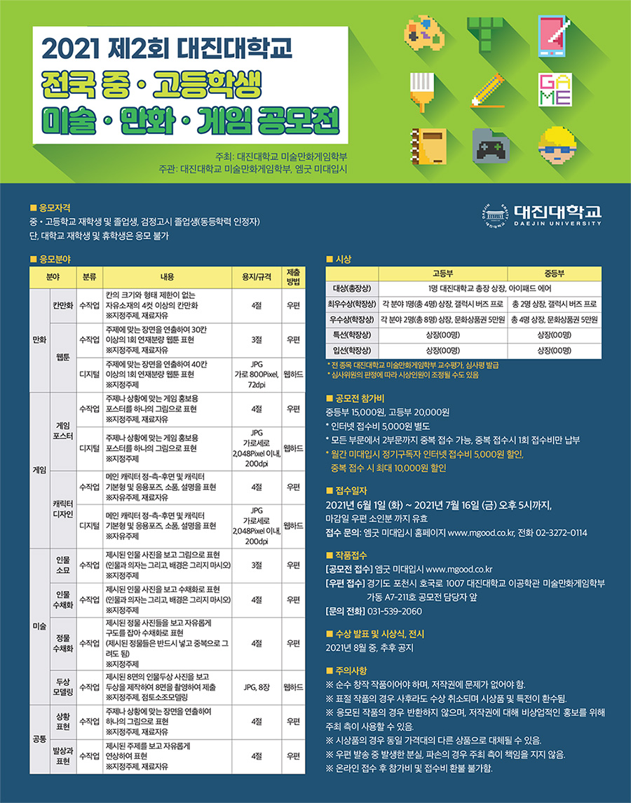 우편 접수: 경기도 포천시 호국로 1007 대진대학교 이공학관 미술만화게임학부 가동 A7-211호 공모전 담당자 앞