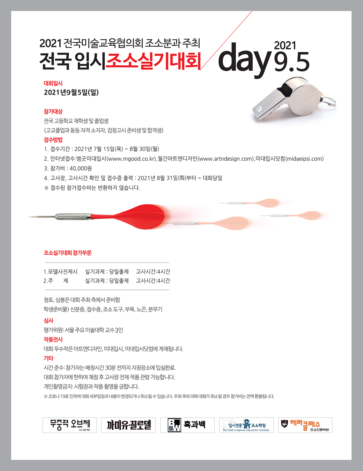 예정 예정 접수중 접수중 접수마감 접수마감 접수증 배포 접수증 배포 고사장배정 고사장배정 대회종료 대회종료 1 예정 2 접수중 3 접수마감 4 접수증 배포 5 고사장 배정 6 대회종료 [실기대회] 2021 전국미술교육협의회 조소분과 주최 전국 입시조소실기대회 조회수 : 8753 공유하기 자세히보기 주최/주관 전국미술교육협의회 조소분과 참가자격 고등학교 재학생고등학교 졸업생 및 검정고시 합격생 대회부문 [목동]모델사진제시, [목동]주제, [홍대]모델사진제시, [강남]모델사진제시, [홍대]주제, [강남]주제 대회일자 2021-09-05 (일) 접수기간 2021-07-15(목) 10:00 ~ 08-30(월) 23:50 접수증 출력 2021-09-03(금) 10:00 ~ 09-05(일) 23:50 수상발표 미정 대회장소 접수 엠굿[미대입시]   T.02-3272-0114 문의하기 목록 과년도 요강보기