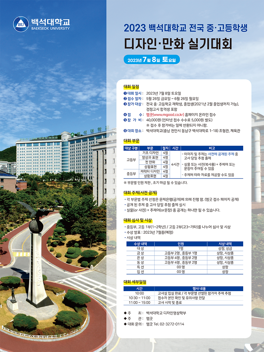 | 수상발표 | 2023-07-31(월) 09시 | 대회장소 | 백석대학교(충남 천안시 동남구 문암로 76) 체육관, 조형관 |