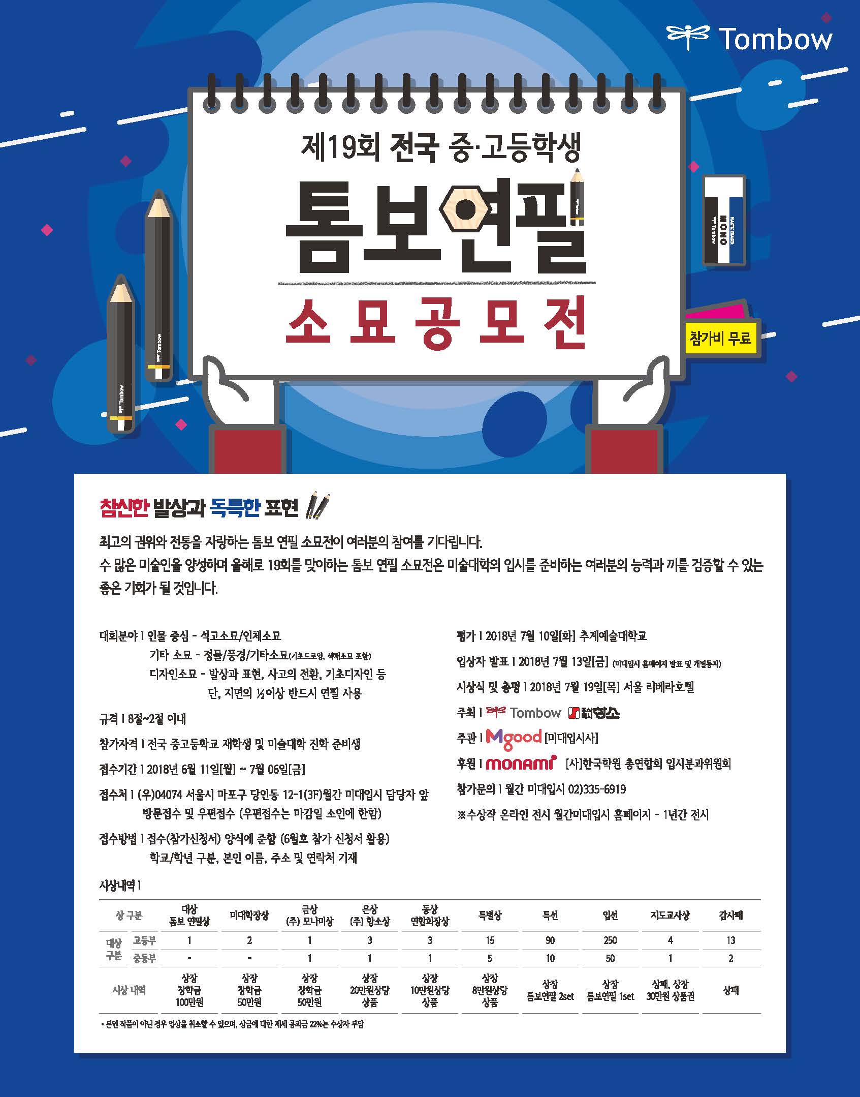 수많은 미술인을 양성하며, 올해로 18회를 맞이하는 톰보연필소묘전은 미술대학의 입시를 준비하는 여러분의 능력과 끼를 검증할 수 있는 좋은 기회가 될 것입니다.