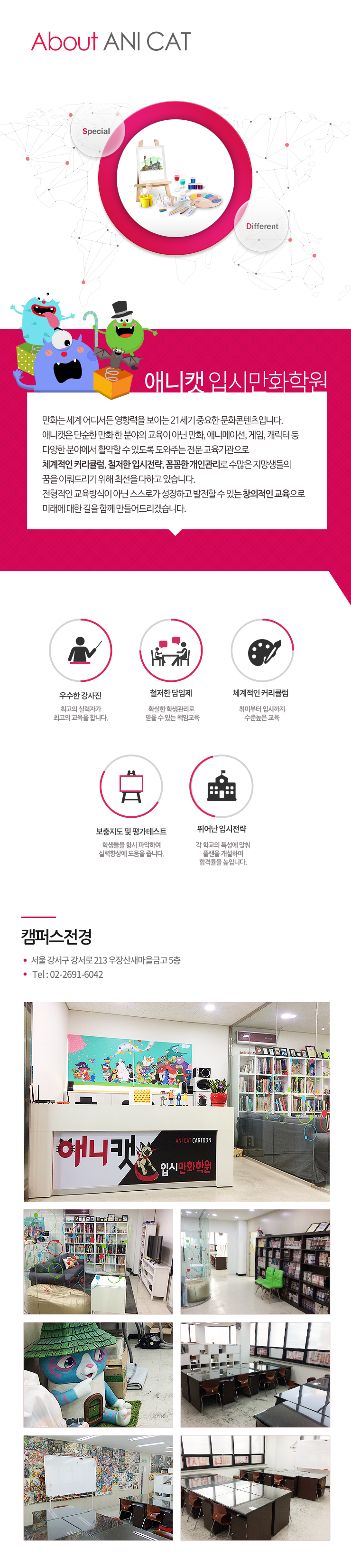 애니캣 미술학원은 만화, 애니메이션, 웹툰 입시 전문 학원입니다. 실기 지도 경력 20년차의 원장선생님을 필두로 다수의 뛰어난 강사를 보유하고 있으며, 소수정예 시스템으로 체계적인 지도와 학생 별 맞춤식 교육을 지향하고 있습니다. 또한 학생을 위한 복지와 정기적인 상담 지도로 학생 한 명 한 명을 생각합니다.