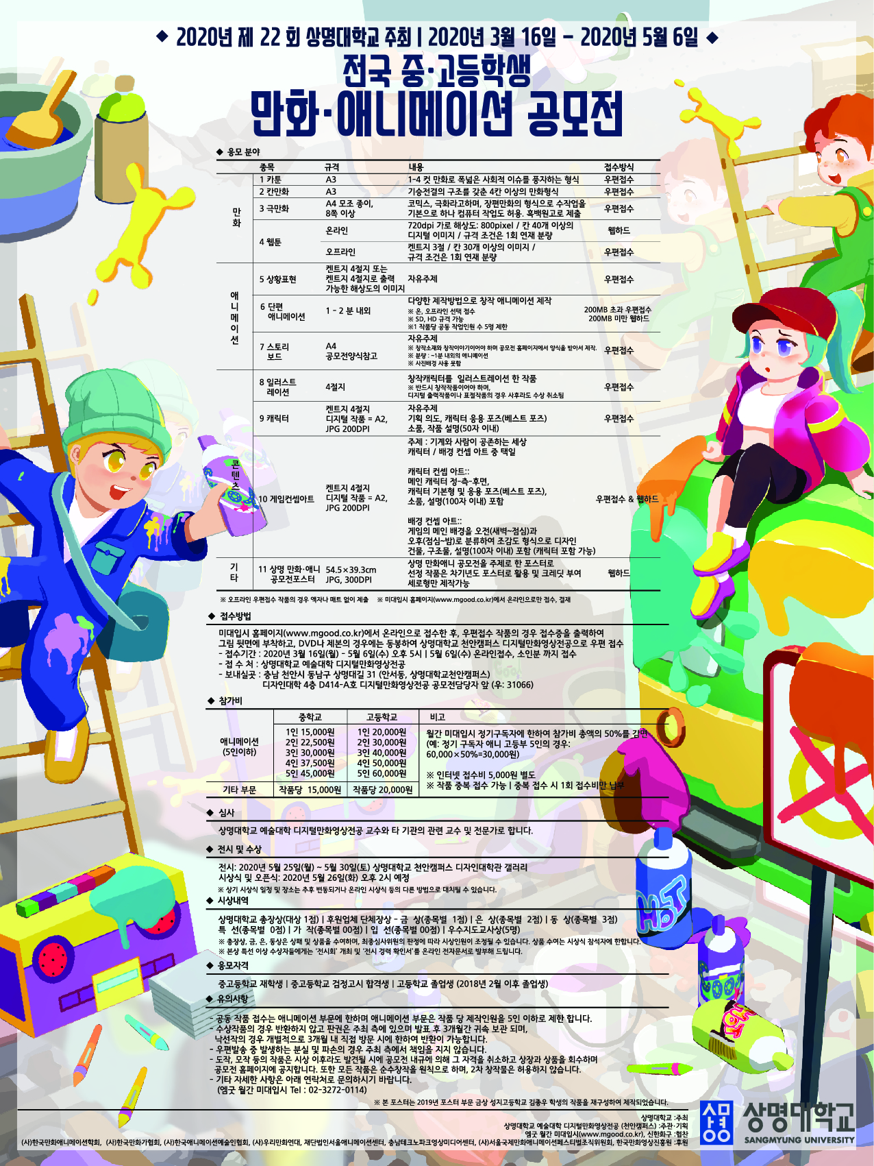 - 보내실곳 : 충남 천안시 동남구 상명대길 31 (안서동, 상명대학교천안캠퍼스) 디자인대학 4층 D414-A호 디지털만화영상전공 공모전담당자 앞 (우: 31066) TEL: 041-550-5251,5252