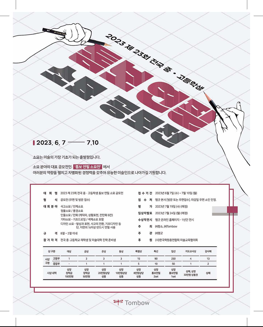 예정 예정 접수중 접수중 접수마감 접수마감 접수증 배포 접수증 배포 고사장배정 고사장배정 대회종료 대회종료 1 예정 2 접수중 [작품반환/상장신청] 상장 신청 - 2023 톰보 연필소묘 공모전 조회수 : 5011 공유하기 자세히보기 주최/주관 작품반환 및 상장발송 참가자격 수상자 행사부문 [톰보] 상장 발송 대회일자 접수일 (목) 주최 작품반환 및 상장발송 2023 제23회 전국 중·고등학생 톰보 연필 소묘 공모전 T.1528 접수 엠굿[미대입시]   T.02-3272-0114 문의하기 목록 과년도 요강보기