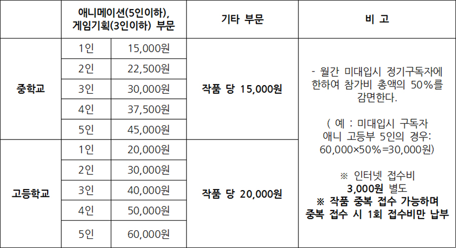 ․공동 작품 접수는 애니메이션 부문과 게임기획 부문에 한하며 애니메이션 부문은 작품 당 제작인원을 5인 이하, 게임기획 부문은 작품 당 제작인원을 3인 이하로 제한한다.