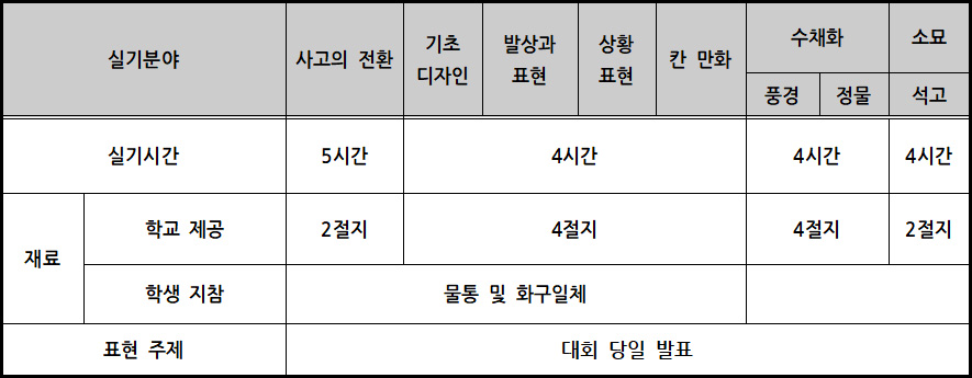 사고의전환, 기초디자인, 발상과표현, 상황표현, 칸 만화, 수채화(풍경), 수채화(정물), 소묘(석고) |