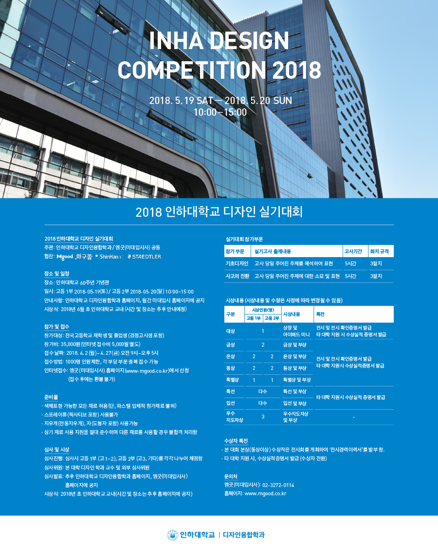 인하대학교에서는 디자인 분야에 관심을 갖고 있는 전국의 우수한 대입 지망생들에게 자신의 실력을 발휘할 수 있는 기회를 제공하며 차세대 디자이너 발굴 및 지원 육성을 통한 인재양성에 기여하고자 본 디자인 실기대회를 개최합니다.