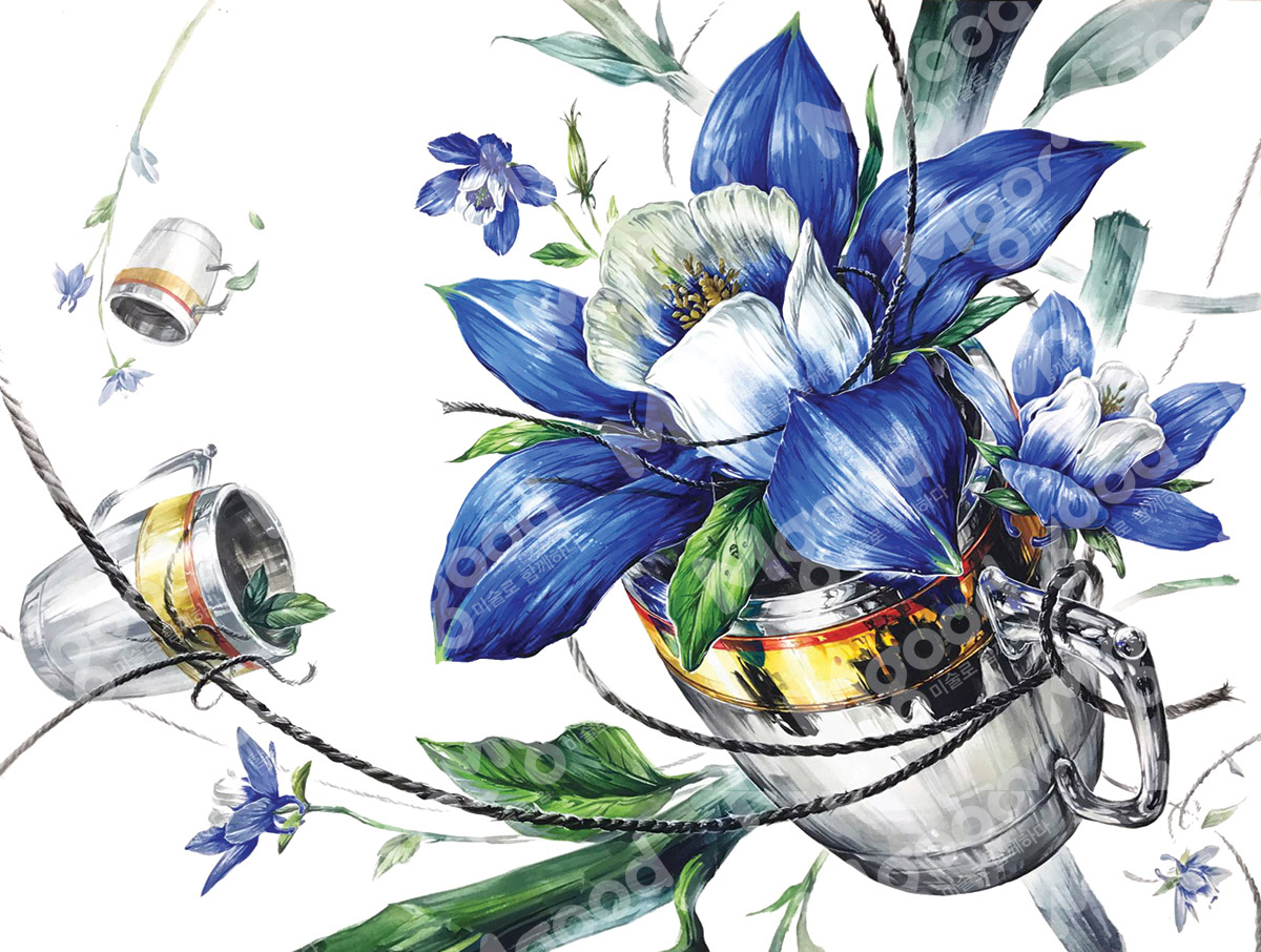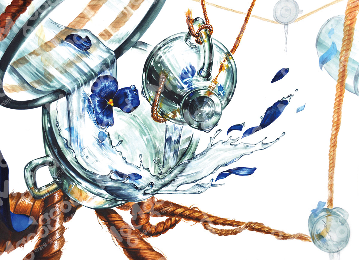 새빨간 꽃잎이 시선을 사로잡으며 티 인퓨저의 자연스러운 형태, 투시로 전체 공간뿐만 아니라 소소한 앞, 뒤 공간도 풍부히 만들어 낸다. 꽃잎을 자세히 보면 빛을 정면으로 받은 부분, 그림자가 드리운 부분, 인퓨저 안의 그림자 등빛과 어둠의 표현이 섬세하게 다뤄져 공간에 실제감을 더해준다.