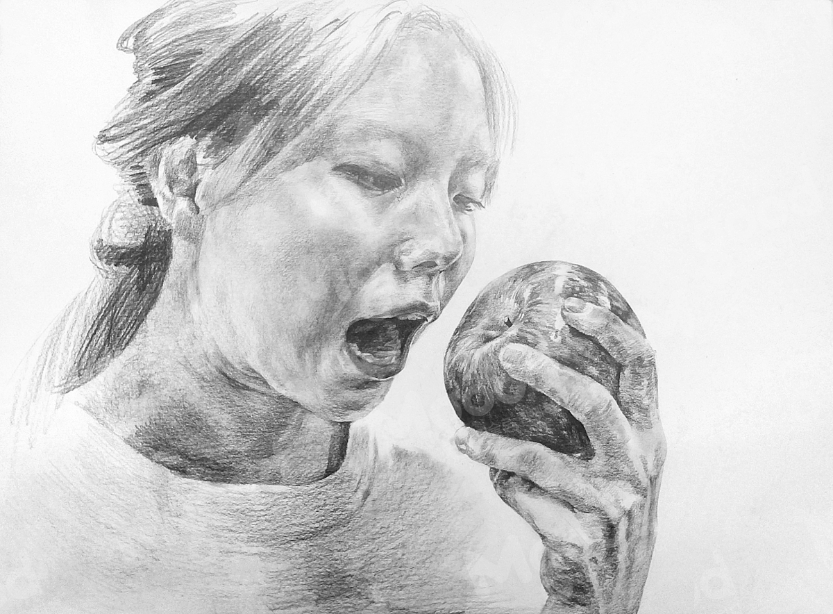 사과를 들고있는 손도, 입으로 향하고 있으며, 부드럽게 흘러내는 머리카락도 전체 모습을 더 실감나게 나타내주고 있습니다.