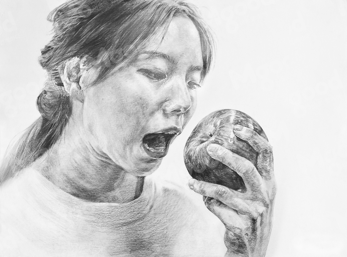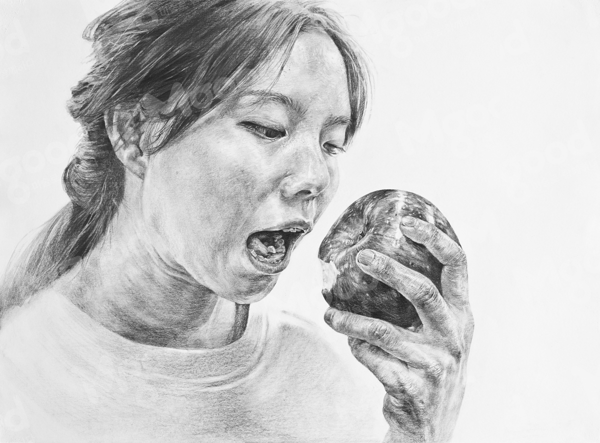 완성입니다. 얼굴 표정에서 오는 근육의 자연스러운 움직임이 사과를 먹고자 하는 아이의 모습을 더 강하게 보여주고 있습니다.