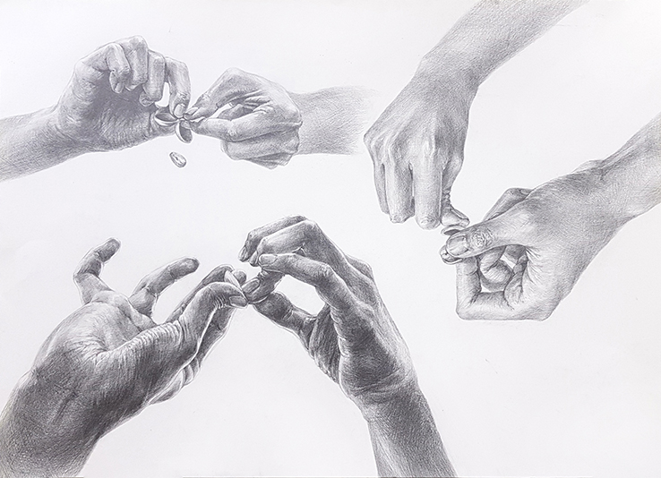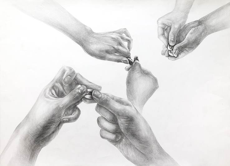 손끝의 힘이 들어간 부분이 포인트가 되도록 디테일에 신경을 쓰자. 힘이 가해진 손동작과 그렇지 않은 손에는 어떤 차이가 있을까. 손을 표현하는 능력을 기본으로 하고, 그에서 느껴지는 힘과 동작의 자연스러움, 재료와 톤의 활용 등을 주요 포인트로 삼고 그림을 감상해보자.