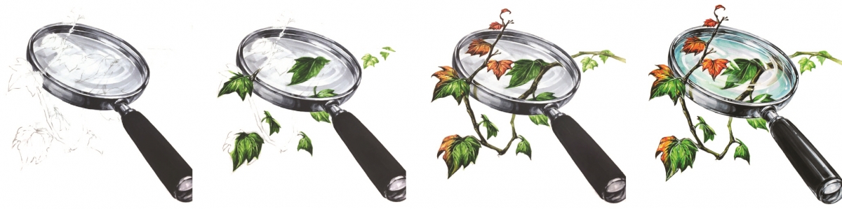 NEXT BASIC DESIGN - 기초질감표현2 작성자   김순필      날짜   2018.05.25      조회수   3286      공유하기 ( 담쟁이 넝쿨과 돋보기의 개체표현 ) 돋보기는 출제 빈도가 매우 높은 소재 중 하나이다. 주로 시각적 특성을 활용하는 등의 제시어가 따라 붙는다. 그렇기 때문에 돋보기의 렌즈부분에서 굴절되는 형상을 부각되도록 표현 할 필요가 있다. 렌즈 부분에 포인트 부분이 올라가도록 스케치를 하도록 하자. 또한, 담쟁이 넝쿨의 가지부분을 활용하여 공간감을 표현 해 보도록 하자. 목록 [실기정보] 이대 드로잉 2시간 시험작 ... [실기정보]NEXT BASIC DESIGN - ... [실기정보]NEXT BASIC DESIGN - ... [실기정보]NEXT BASIC DESIGN-소재... [실기정보]다양한 행위에서 오는 동세를 연구하고...