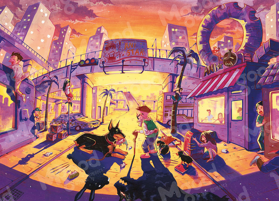 아주 무섭게 생긴 성체 개 한 마리가 목줄이 풀린 채 이리저리 날 뛰어 다니고 있다. 사람들은 혼비백산하여 그 개를 피해 도망을 다닌다. 그런데 그때 갑자기 선글라스를 착용한 수염이 지극한 노인이 나타났는데, 날 뛰던 개가 꼬리를 내리며 조심스럽게 그 노인에게 다가 간다.