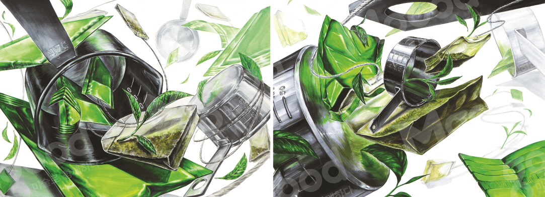 계량컵의 금속 질감과 녹차 티백의 종이질감의 대비가 핵심이다.