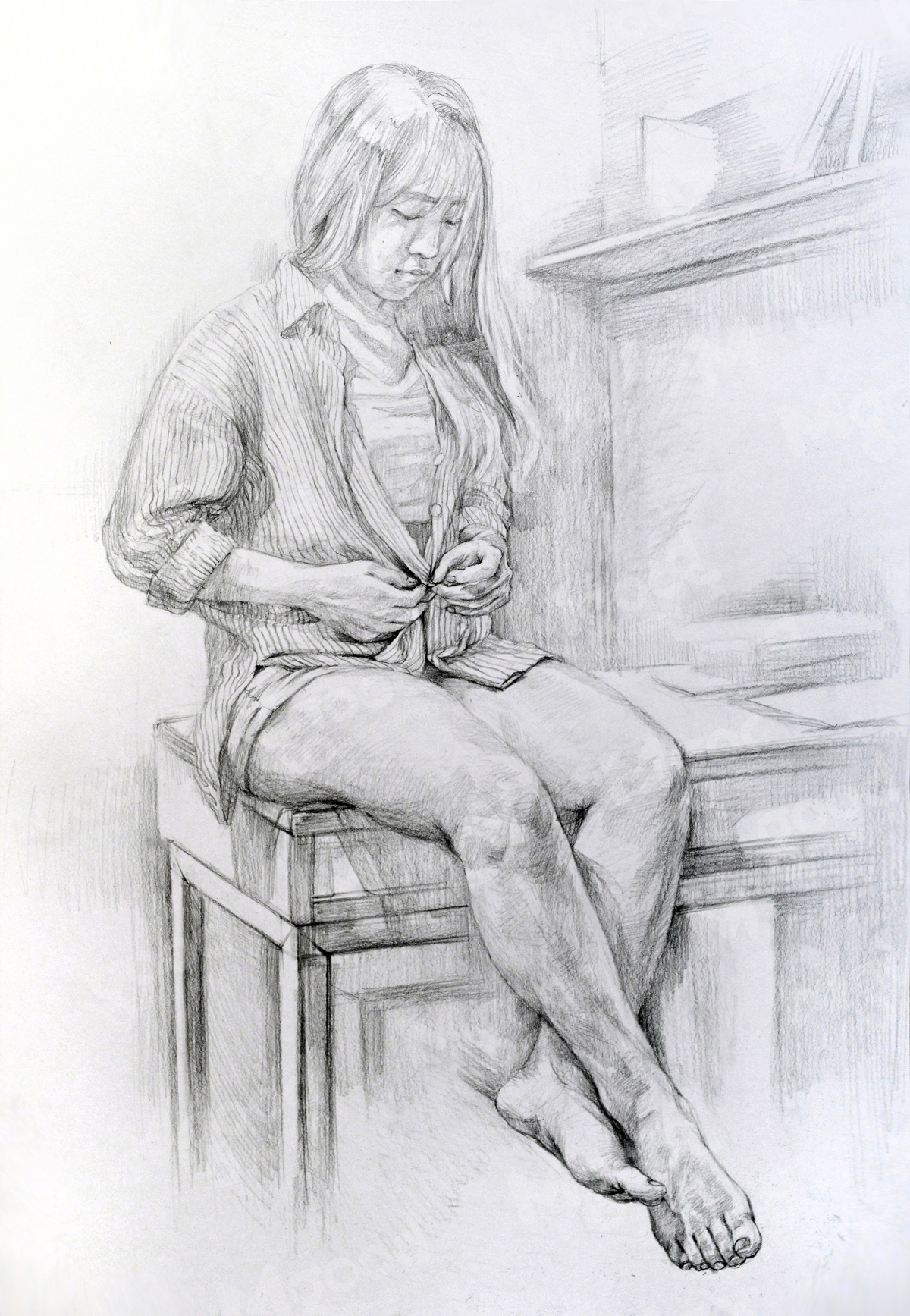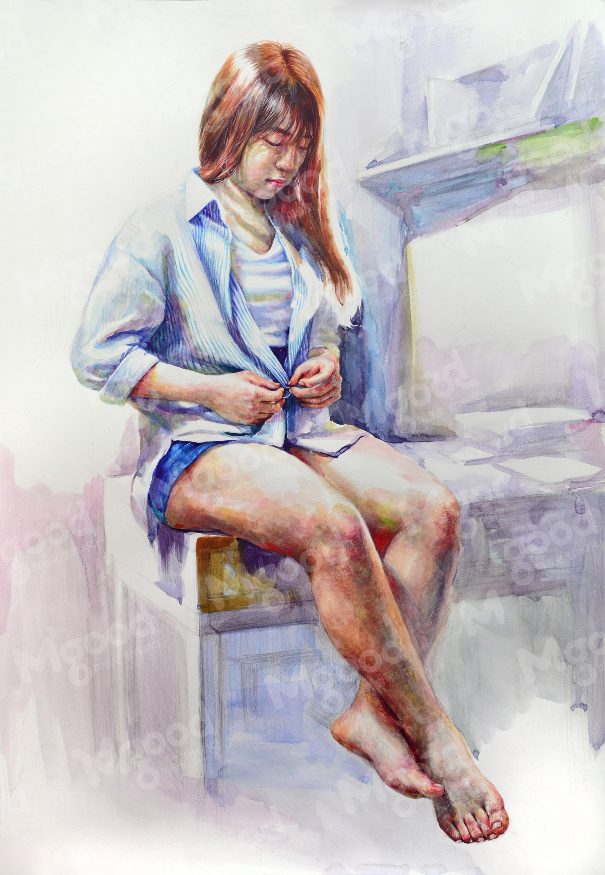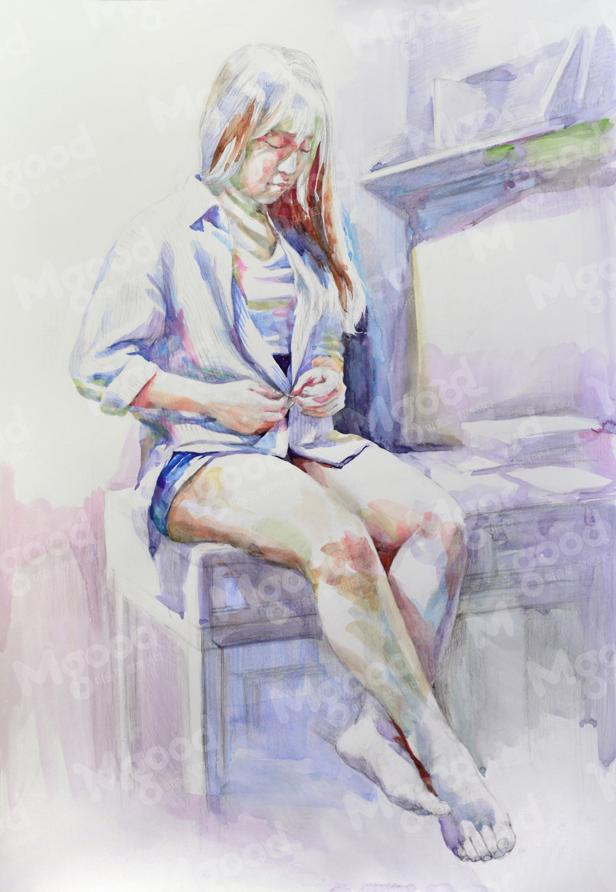 인체수채화 학생 과정작 설명 감상 작성자   허문혁      날짜   2018.09.18      조회수   3655      공유하기 완성 빛에 의한 공간과 인체의 자연스러운 조화가 중요하다. 이점 유의하면서 마무리해주자. 스케치 손동작과 시선의 동작을 자연스럽게 캐치하여 스케치하자. 초벌 인체의 전체적인 색과 주변 상황 그리고 분위기를 통일성 있게 표현하자. 중벌 중요 부위 손과 얼굴시선을 구체화시켜 나가자. 목록 [실기정보] [사고&발상]효과적인표현법_묘사의완급... [실기정보]인체수채화 학생 과정작 설명 감상... [실기정보]DESIGN NEXT – 과정으로 보... [실기정보]대통령초상-미대전공 학부모님들께서 믿... [실기정보]청강대 이미지보드 - 주제에 충실한 ...
