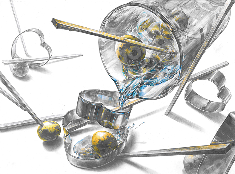[제공된 사물] 하트쿠키커터, 나무젓가락, 물이 든 비커, 메추리알