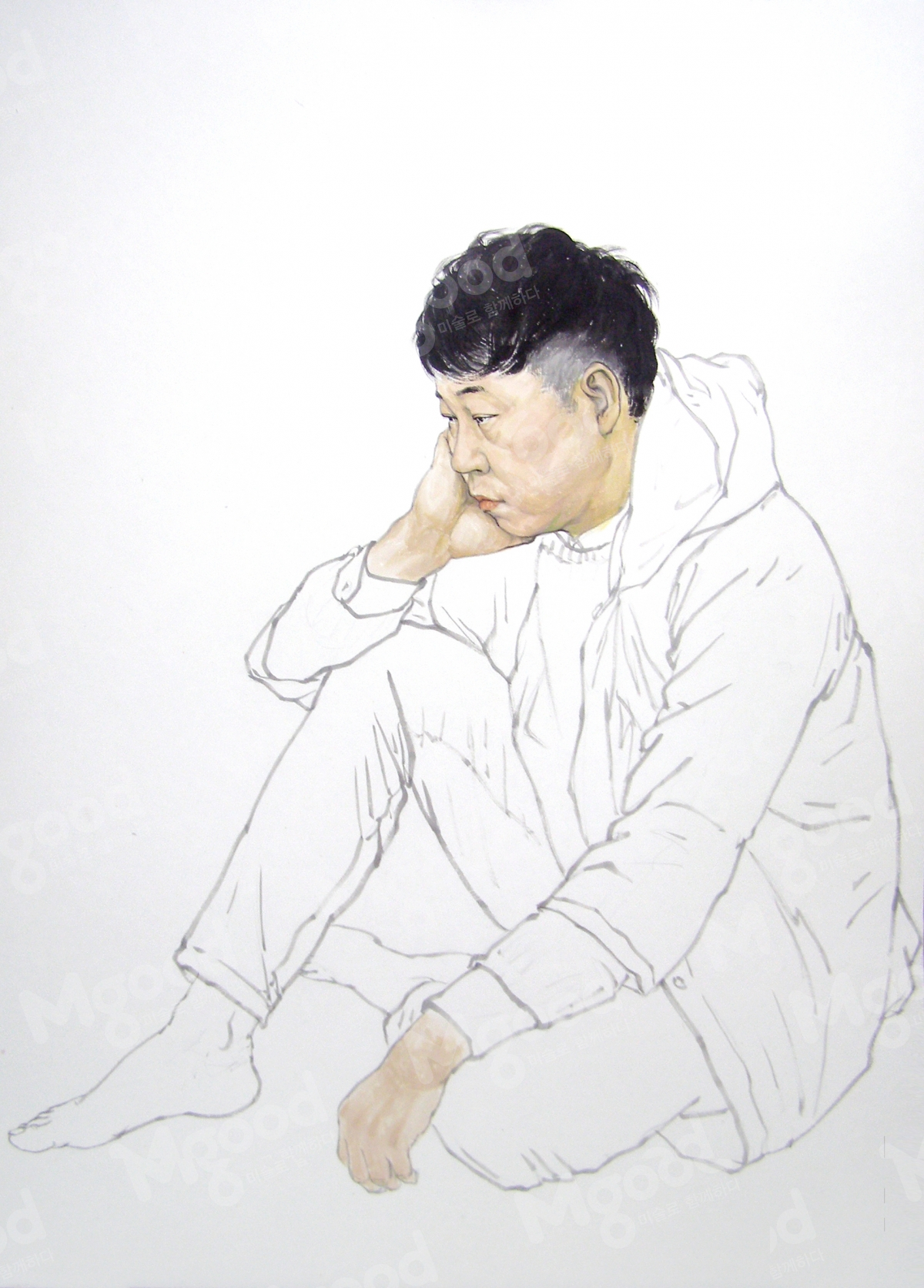 인물의 얼굴, 손과 발의 선을 담묵으로 먼저 표현을 하고 난 뒤, 상체와 하체의 구조를 생각하며 옷의 선을 긋는다.