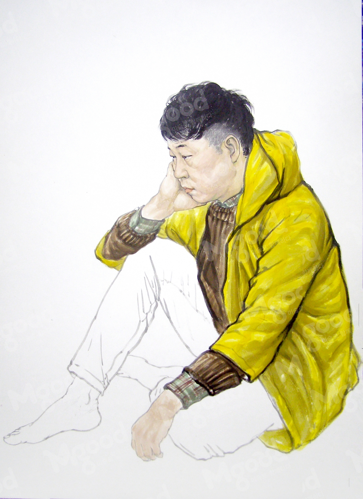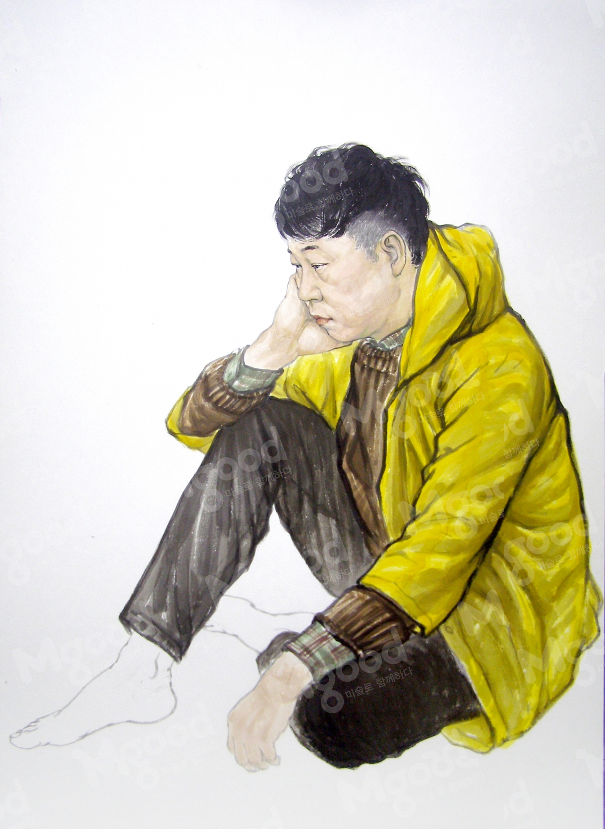 상의와 어울리는 하의 표현을 연구해 보자. 붓터치에 있어 면의 크기, 방향등은 인물의 동세를 표현하는 또 다른 방법이 될 수 있다. 우비가 옷에 걸쳐있지 않은 부분을 좀 더 강하게 표현하면서 어깨와 허리까지의 강약과 농담의 변화에 최대한 신경을 써야한다.