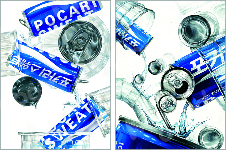 주제 : 제공된 사물들의 조형적 특성을 활용하여 ‘흐름‘을 주제로 표현하시오. [제시물 : 캔음료, 투명컵]