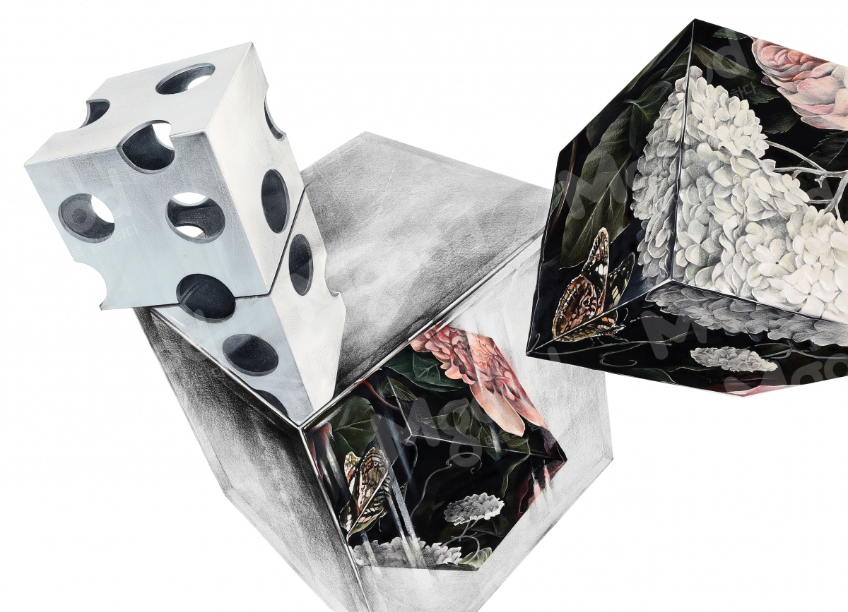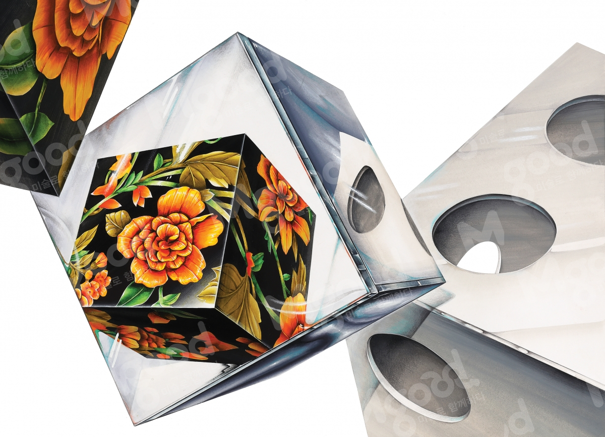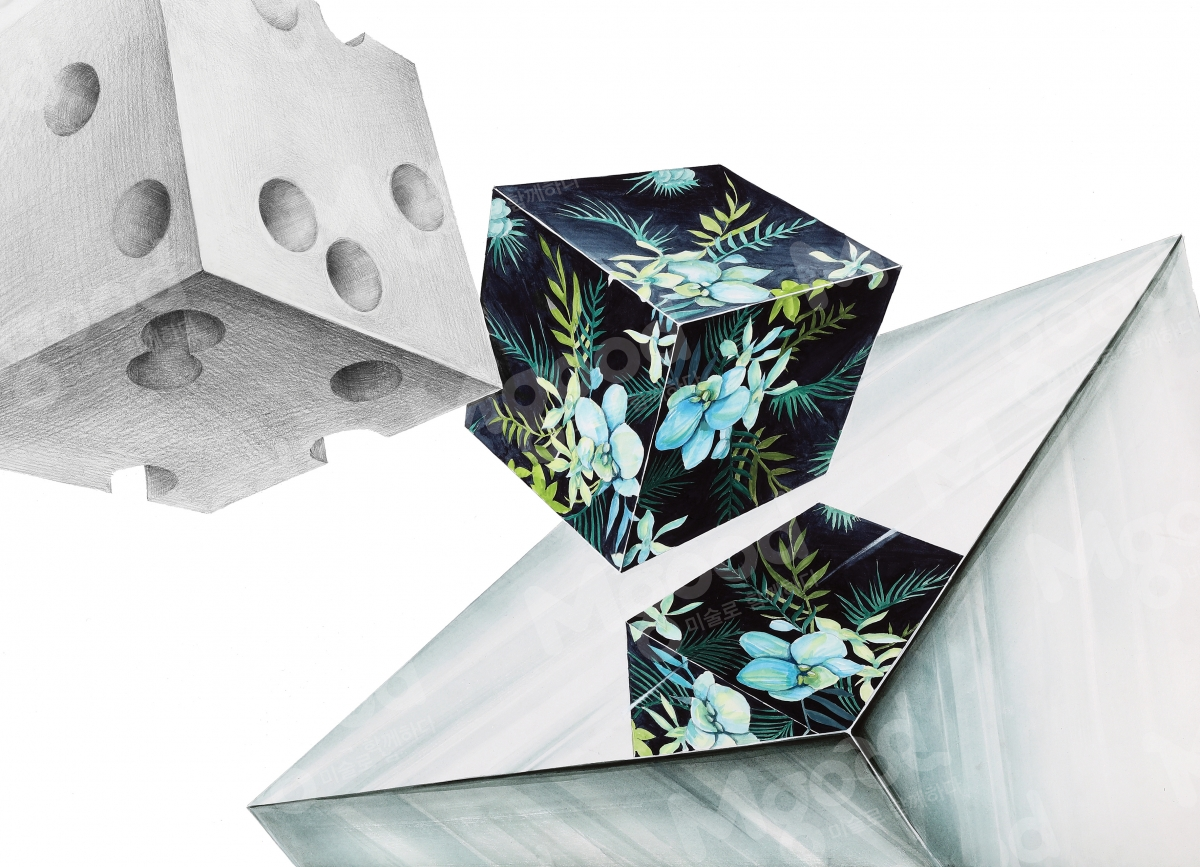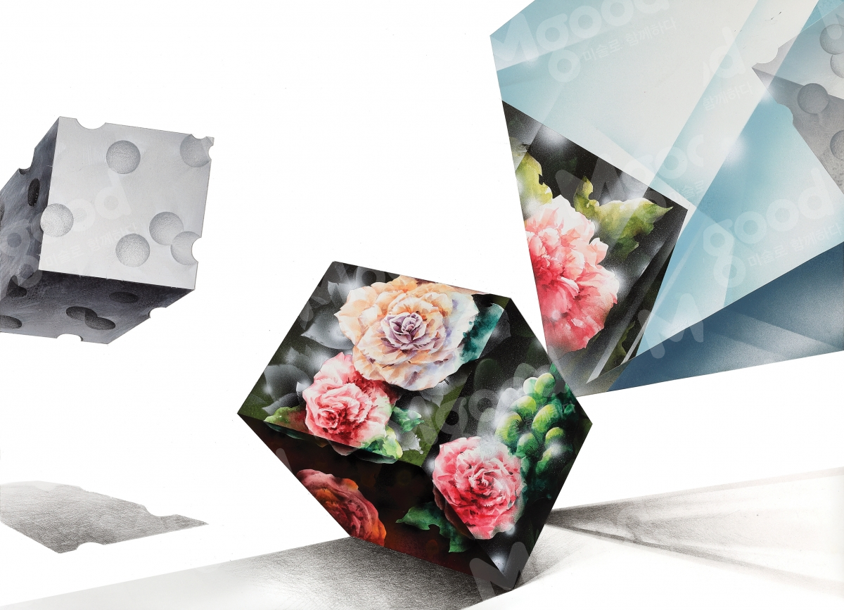 제시문: 그 공간에는 3개의 서로다른 정육면체가 떠다니고 있었다.한 정육면체의 표면은 꽃무늬로 장식되어 있고, 또 하나의 정육면체 표면은 거울로 이루어져 있다. 하얀 플라스틱으로 만들어진 나머지 정육면체의 각 표면에는 동일한 크기의 동그란 구멍이 뚫려 있는데, 구멍의 수는 표면마다 다르다.