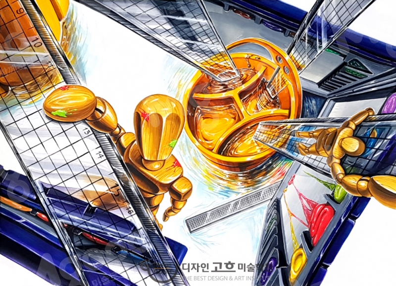 2021 디자인고흐 공모전 - 기초디자인 우수작 작성자   김영복      날짜   2021.08.03      조회수   1964      공유하기 대소비례와 상황연출을 통해 ‘우리 아이가 작아졌어요‘의 제시문을 어떻게 구성하는지에 초점을 두고 감상하세요 - 공간의 시점과 소재들의 시점을 통일시켜 화면을 집중시키는 효과가 좋은 작품이다. 또한 소재들의 고유칼라를 고려한 화면구성으로 고채도를 분산시키지 않고 좁은 공간에 집중시켜 배색의 연출감각도 돋보인다. - 투명자를 활용하여 자칫 파레트의 나열이 지루해 질 수있는 부분을 상쇄시켰으며 적절한 통일과 변화의 조형감 있는 구성이 되었다. - 다만, 파렛트의 공간속으로 멀어져 가는 톤의 변화가 없어 아쉽고, 목각인형이 주제 포인트와 다소 거리감이 있어 시선이 분산되는점은 간과해서 안된다. 주제부 목각인형의 올린손 부분에 떨어지는 물이 닿았다면 하는 아쉬움이 남는다. 게시자의 SNS 게시자의 다른글   581건 목록 [실기정보] 2021 디자인고흐 공모전 - 기초디... [실기정보]2021 디자인고흐 공모전 - 기초디... [실기정보]평택 창조의아침... [실기정보]2021 디자인고흐 공모전 - 기초디... [실기정보]2021 디자인고흐 공모전 - 기초디...