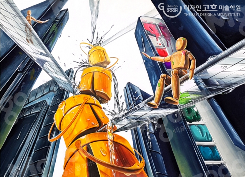 2021 디자인고흐 공모전 - 기초디자인 우수작 작성자   김영복      날짜   2021.08.05      조회수   1496      공유하기 대소비례와 상황연출을 통해 ‘우리 아이가 작아졌어요‘의 제시문을 어떻게 구성하는지에 초점을 두고 감상하세요 - 실제 영화로 만들어 지면 이런 장면이 영화내용을 대표하는 포스터로 활용되어도 부족함이 없어 보인다. - 사물간 크기대비 반전대비가 인상깊었고, 작품을 감상하는 내내 주제부 작은 목각인형의 포즈가 끝까지 긴장을 놓치지 않았다. - 다만, 드라마틱한 연출력에 반해 사물 관찰을 통해 정확한 형태를 읽었다면 하는 부분과 특히 물통부분은 손잡이등등 물통의 색감표현 이외에 사물에 대한 관찰이 매우 아쉬운 작품이다. 게시자의 SNS 게시자의 다른글   581건 목록 [실기정보] 2021 디자인고흐 공모전 - 기초디... [실기정보]2021 디자인고흐 공모전 - 기초디... [실기정보]월곡창조의아침] 수시대비 기초디자인 ... [실기정보]2021 디자인고흐 공모전 - 기초디... [실기정보]2021 디자인고흐 공모전 - 기초디...
