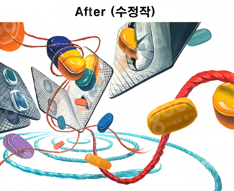 2021 디자인고흐 예비반 공모전 - 기초디자인 우수작 작성자   김영복      날짜   2021.09.07      조회수   1575      공유하기 포장된 알약과 실을 이용하여 ‘리듬감‘을 표현하시오.(색상자유) 리듬감을 구성하는 방법, 알약과 실의 관계, 색상의 사용 등에 유의하여 감상하세요 - 선을 화면밖으로 극대화 시켜 화면의 확장성을 살린 작품이다. - 면재(알약케이스)의 움직임이나 점재(알약)의 배치가 절제된 화면구성의 조형성을 살려 주었다. - 다만, 점,선,면요소의 비중이 서로 비슷하여, 무난한 연출이긴 하나 유니크한 구성이 없어 다소 밋밋해 보인다. - 점,선,면의 비중도를 3:3:3 보다는 2:3:5혹은 1:2:7으로 비율을 조절한다면 더욱 더 개성있는 연출이 돋보였을 것이다. 수정본 그림입니다. 게시자의 SNS 게시자의 다른글   581건 목록 [실기정보] 연필깍기+연필 주제부 조형수업... [실기정보]2021 디자인고흐 예비반 공모전 -... [실기정보]포도 개체묘사 ... [실기정보]그림이 제일 쉬웠어요... [실기정보]스테이플러 + 포스트잇 주제부연출...