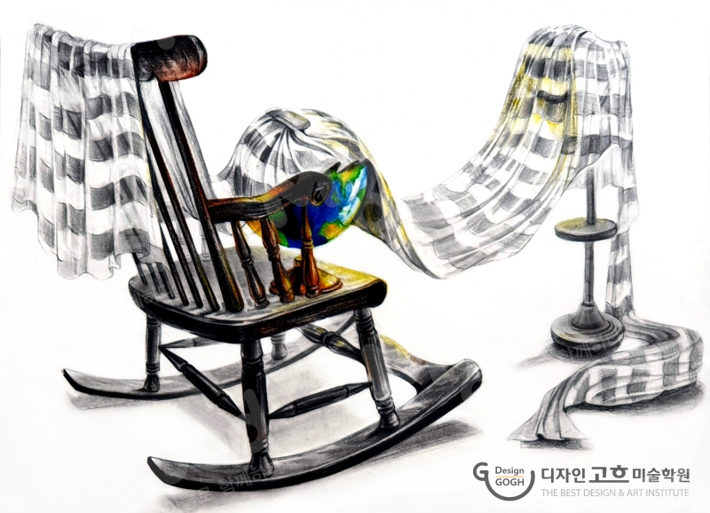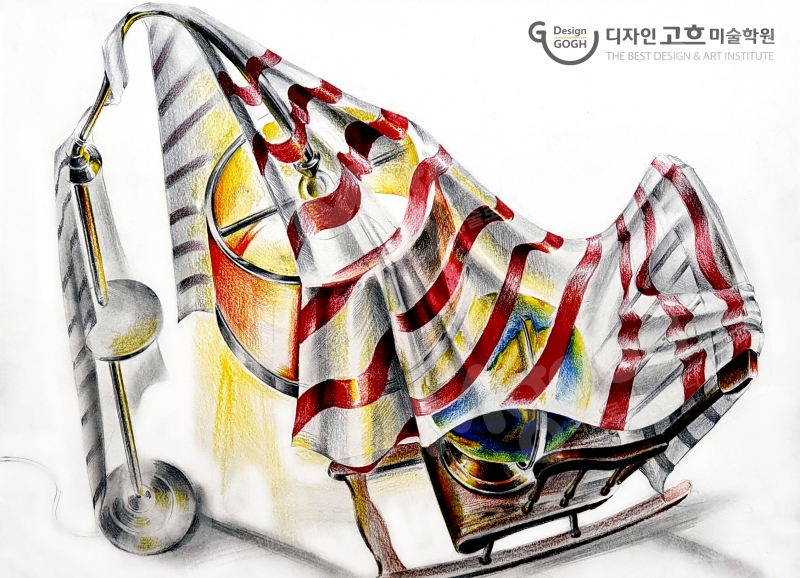 기초조형 학생우수작 작성자   김영복      날짜   2022.05.25      조회수   1748      공유하기 흔들의자, 지구본, 스탠드 조명이 줄무늬 천에 1/2 이상 덮힌 모습을 표현하시오. 천에 덮인 사물이 인지될 수 있도록 설정한 실루엣 표현과 중력에 의한 주름 표현에 주목하여 감상하세요. 게시자의 SNS 게시자의 다른글   581건 목록 [실기정보] [기초디자인]그림도 결과도 쨍하다_주... [실기정보]기초조형 학생우수작... [실기정보]노원창조의아침] 유리컵과 빨대 기초디... [실기정보]노원창조의아침] 전구 & 연필 개체묘... [실기정보]노원창조의아침] 노끈 개체묘사...