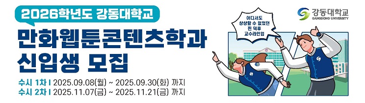 대학탐방 우송정보대학_만화웹툰과 학과 소개 ‘한국대표 명장’을 키우는 명품대학 우송정보대학이 야심 차게... 2025. 11. 10 우송정보대학_만화웹툰과 2025-11-10 용인예술과학대학교_토이캐릭터디자인과 2025-10-31 용인예술과학대학교_웹툰만화과 2025-10-31 용인예술과학대학교_스타일리스트과 2025-10-31 실기대회 접수중 2025 제4회 서원대학교 웹툰 콘텐츠 공모전 칸만화, 상황표현, 일러스트레이션, 캐릭터 접수기간 : 2025-10-31 ~ 2025-12-11 마감 2025 전국미술교육협의회 조소분... 마감 : 08-07 (목) 마감 2025 청강문화산업대학교 콘텐츠... 마감 : 07-08 (화) 마감 2025년 서경대학교 무대패션전공... 마감 : 08-08 (금) 마감 2025 청주대학교 전국 중·고등... 마감 : 08-19 (화) 미대입시 추천 우수학원 [마포구 - 조소]홍대 헤라클레스미술학원 실기연재 상담신청 [강남구 - 유학미술]씨존만화학원 실기연재 상담신청