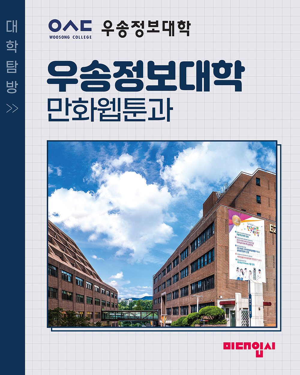 ‘한국대표 명장’을 키우는 명품대학 우송정보대학이 야심 차게 신설한 만화웹툰과에서 소수정예 수시모집 신입생을 선발한다. 학과의 목표는 예술성, 창작 윤리, 휴머니즘을 갖추고 언제든 현장에 뛰어들 수 있는 ‘21세기 웹툰 산업의 횃불’을 발굴하는 것이다. 30여 년간 서양화가로 활동하며 오랜 교육 경력을 지닌 김영지 학과장이 학과 창설이라는 과업을 맡아, 현역에서 활발히 활동 중인 젊고 열정적인 웹툰 작가들을 교수진으로 구성했다. 독특한 이름의 커리큘럼과 그에 걸맞은 특색있고 재미있는 수업, 그리고 실질적인 1:1 교육을 통해 최신 트렌드를 반영한 웹툰 작가와 프로 어시스턴트의 실용적인 노하우를 전수한다. 이를 통해 새로운 K-문화 창작 리더가 될 인재를 길러내고 있으며, 이 야심 찬 교수진은 만화·웹툰 교육계에 새로운 강자의 등장을 예고한다.