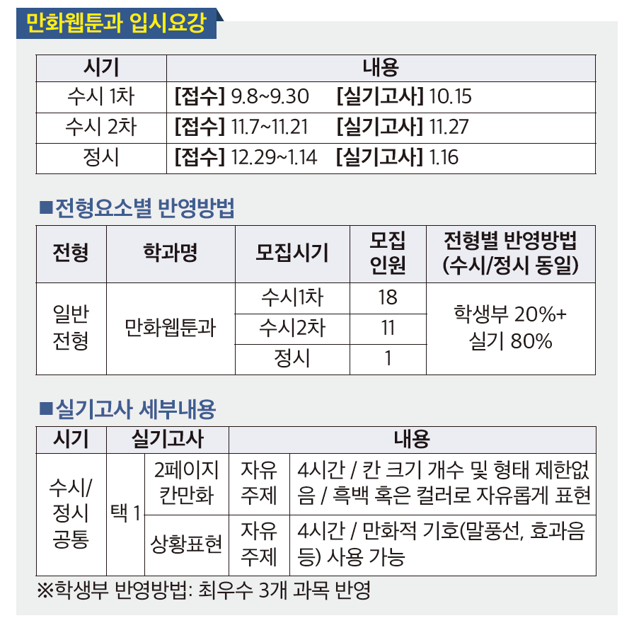 만화웹툰과는 학생 개개인의 소질과 개성을 살리는 1:1 맞춤 교육을 통해 실무 전문가를 양성한다. 1인 창작자에게 필요한 기초 작화와 컴퓨터 활용 능력과 웹소설, 시나리오, 웹툰 기획 PD, 3D 모델링 등 웹툰 산업의 다양한 분야로 진출할 수 있도록 특성화된 실습 커리큘럼을 제공한다. 네이버웹툰, 카카오웹툰 등에서 활동하는 현직 작가들의 특강과 1:1 밀착 지도를 통해 학생들의 창작 활동을 돕고, 졸업 후 미래 지향적인 전문가로 성장하도록 지원한다. 졸업 후에는 만화·웹툰 작가, 웹툰 PD, 시나리오 작가, 캐릭터 디자이너 등 다채로운 분야로 진출할 수 있으며, 관련 플랫폼이나 콘텐츠 제작사 취업, 4년제 대학 편입 등 다양한 기회가 열려 있다. 또한, 그래픽 기술 자격증(GTQ), 컴퓨터그래픽스운용기능사, 웹디자인기능사 등 관련 자격증을 취득해 전문성을 더욱 강화할 수 있다. |